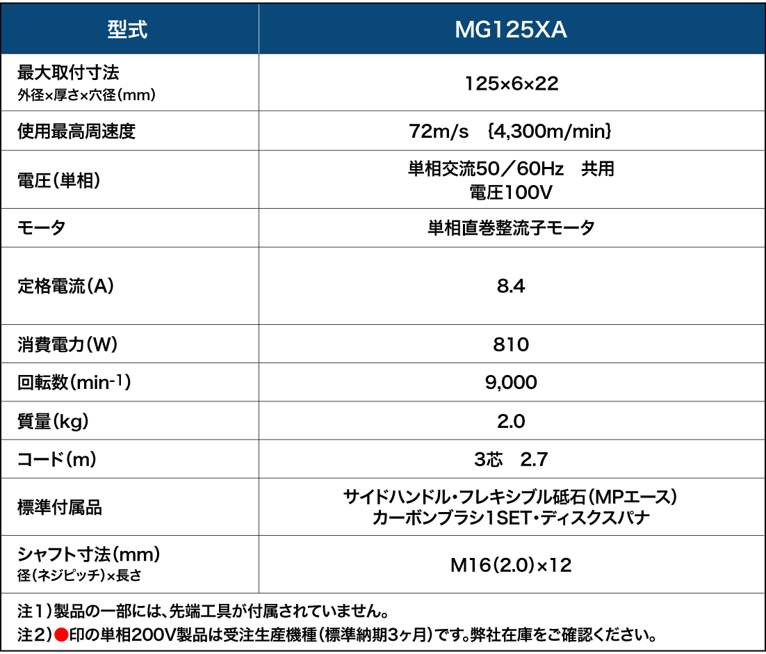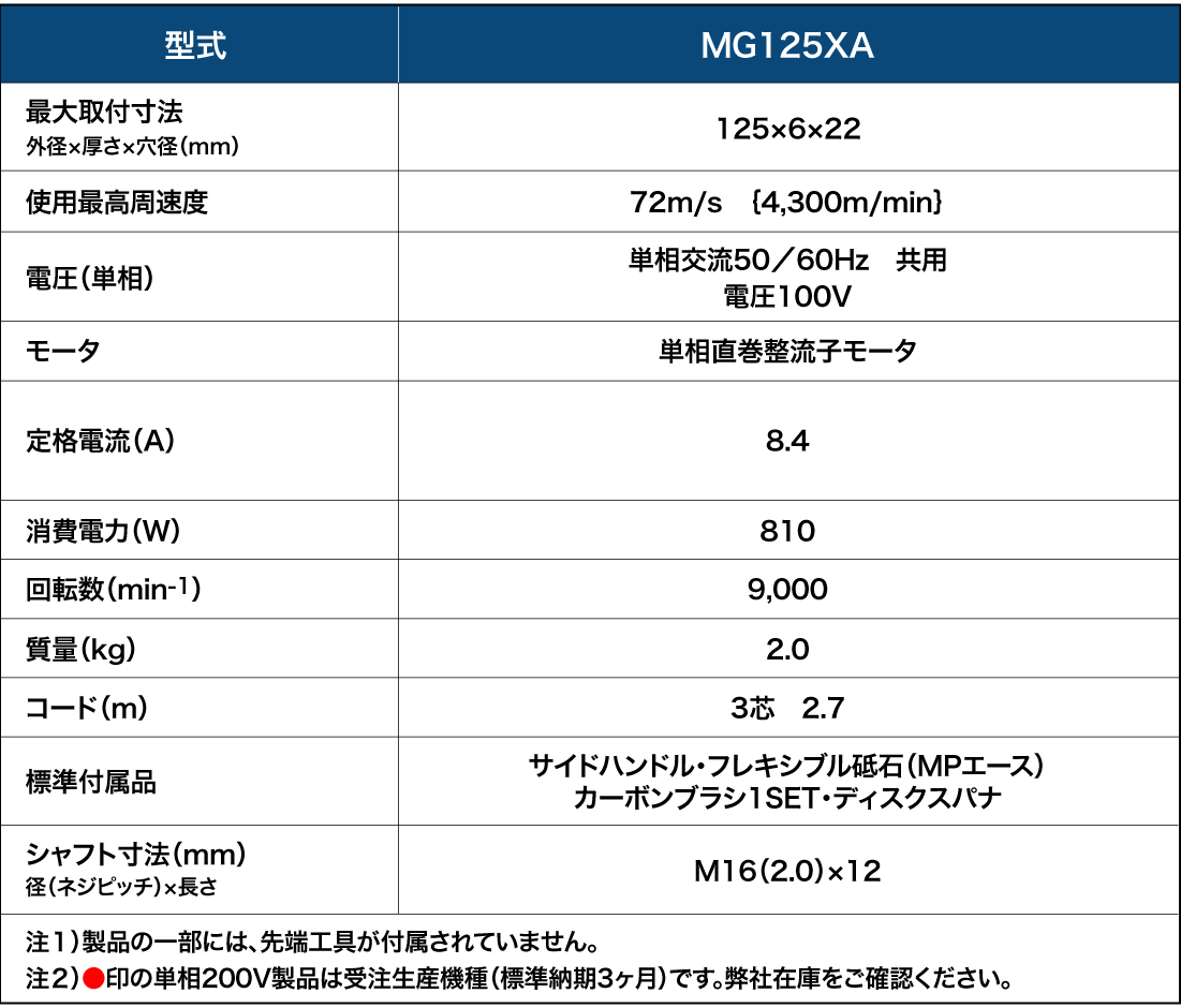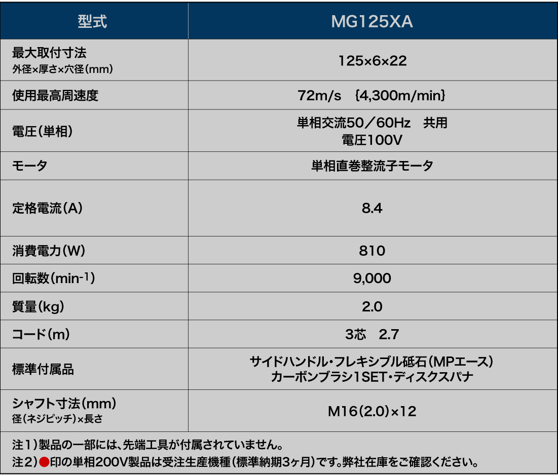 MG125XA ・最大出力1200W強力モータ ・標準径125mmハンディータイプ ダウンロードの前に必ずお読みください。 取扱説明書PDF(2019年6月現在): 866KB 機種 希望小売価格(消費税別) 備考 MG125XA 100V \29,000 ・掲載製品の希望小売価格は予告なく変更になる場合がございます。 ・製品の色はご覧になるモニターの環境によっては実際の色とは若干異なる場合がございます。 ・製品の仕様及び外観などは改良等のため予告なく変更する場合がございます。