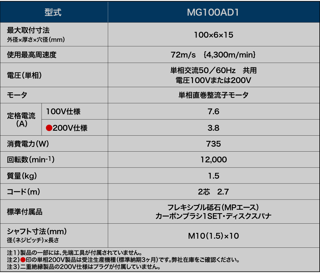 MG100AD1 ・ベビーの決定版・クラス最高1000W高性能細径モータ搭載 ・細径、二重絶縁、プロ仕様 ダウンロードの前に必ずお読みください 機種 希望小売価格(消費税別) 備考 MG100AD1 200V \8,800 在庫僅少品 ・掲載製品の希望小売価格は予告なく変更になる場合がございます。 ・製品の色はご覧になるモニターの環境によっては実際の色とは若干異なる場合がございます。 ・製品の仕様及び外観などは改良等のため予告なく変更する場合がございます。